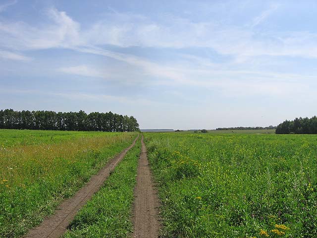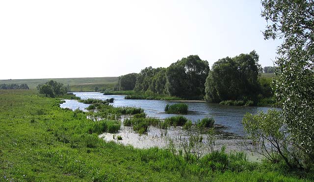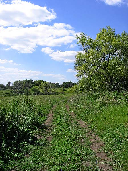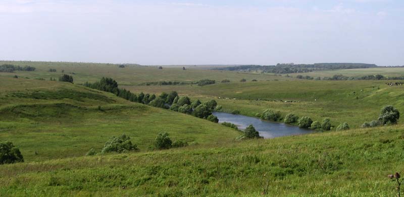 Зато потом идти оказалось легко и интересно. Речка в этих местах сильно расширяется и уже похожа на полноценную реку. Плутая лугами, полями, дорогами, берегами и старательно обходя стороной стада корофф, я добрался до вожделенной деревнии. Ну деревня как деревня. Правда места на мой вкус красивыя и привольныя (хотя с нашей Проней-Городищем не сравнить). Немного потоптавшись и пострашив возвращавшихся с лугов корофф, я пошел назад. Возвращался дорогой, которая довольно быстро привела меня к ручью (через который я уже переправлялся по камешкам, рискую для симметрии сломать левую руку), а потом и домой. Так что день в целом удался, если не считать звездюлей, которых мне навешали по телефону с работы... :)